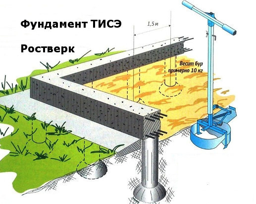 Dans les zones marquées, ils creusent des trous avec une pelle sur une demi-baïonnette. Ensuite, ils passent directement au forage. Pour cette procédure, un outil de base est acheté, conçu pour fonctionner spécifiquement dans la technologie TISE. La profondeur de cette perceuse est régulée par une tige en deux parties et pour élargir la base, elle est équipée d'une pelle spéciale. Il y a un dispositif pour ramasser et ameublir le sol.