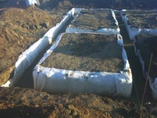 Le tissu est posé au fond de la tranchée pour protéger la couche de sable et de gravier de l'humidité. Les bords du géotissu sont enveloppés sur un oreiller avec un léger chevauchement. Le matériau est placé à l'intérieur du coffrage de sorte qu'après le coulage, il se trouve à l'extérieur de la bande de bande et le protège de l'humidité.