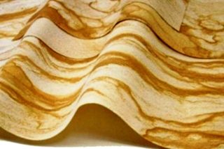 Dans les carrières, les couches rocheuses sont découpées en plaques jusqu'à 3 mm d'épaisseur et collées à la base. Un tel matériau est moins flexible, car les plaques peuvent heurter le coin de la maison ou tourner - un ajustement minutieux sera nécessaire.