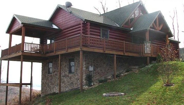 Une maison en rondins sur pilotis vissés est posée sur les éléments :