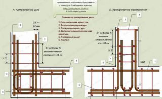 Lors de la création d'une dalle monolithique verticale et fermée, il est recommandé d'utiliser la même technologie pour tricoter les coins de renfort. Cela créera une marge de sécurité égale dans toute la fondation. Même si le ruban est coulé sur le grillage, ces zones restent toujours critiques en termes de charge.
