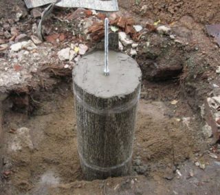 Les supports encastrés à une telle base sont formés en versant la solution dans les niches profondes préparées (sous le point de congélation).Les piliers sont placés le long du périmètre du bâtiment et à la jonction des murs. En section, ils peuvent avoir la forme d'un carré ou d'un cercle. Les supports dépassent de 0,4 à 0,5 m au-dessus du sol, s'unissant en une structure commune avec un grillage.