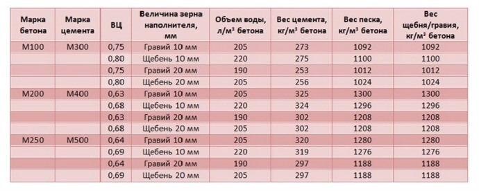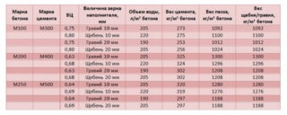 Après avoir calculé le volume de la fondation en m³, il est également nécessaire de déterminer la quantité requise de composants du mélange. Cela dépend de la qualité de béton préférée et du type de ciment utilisé. Pour équiper la fondation, le béton doit avoir un indicateur numérique d'au moins 100. Pour préparer un mélange marqué 200 à partir de ciment de type M400, vous devrez le mélanger avec du sable et de la pierre concassée dans un rapport de 1: 2,8: 4,8. Si vous avez besoin de béton de grade 300 ou 400, il n'y aura pas de dominance aussi prononcée des deux derniers composants. Pour la fabrication de mortier de grade 400 à partir de ciment M400, le rapport C : P : U aura la forme 1 : 1,2 : 2,7, pour M500 - 1 : 1,6 : 3,2.