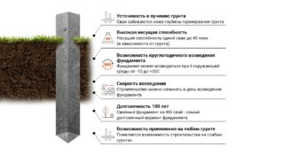 La fondation sur pieux est équipée là où il y a une forte possibilité de déformation ou de destruction du bâtiment en présence de gel/dégel cyclique du sol. Pour éviter les conséquences négatives de ces processus, les pieux doivent être enfoncés à une profondeur qui dépasse le niveau de gel du sol. De plus, lors du fonçage de pieux, il est nécessaire de percer des sols mous et d'obtenir une fondation solide.