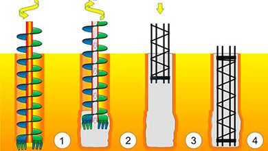 Les pieux forés sont des structures réalisées directement lors de la pose des fondations. Tout d'abord, des trous sont pratiqués sur les sites d'installation dans lesquels des tuyaux de tubage remplis de mortier de béton sont insérés. Pour donner à un tel tuyau la résistance nécessaire, il doit être renforcé avec un cadre pré-préparé.