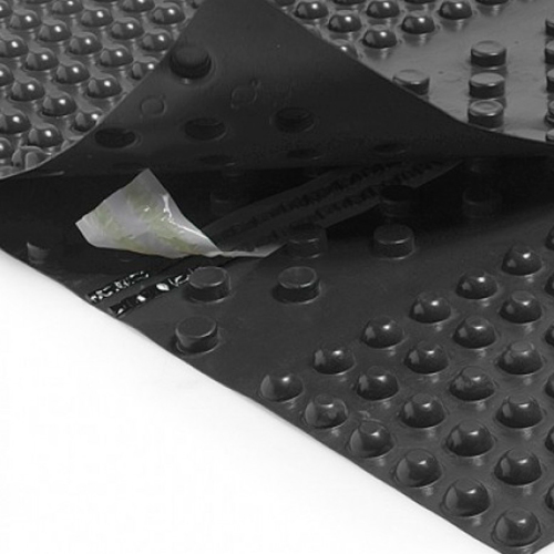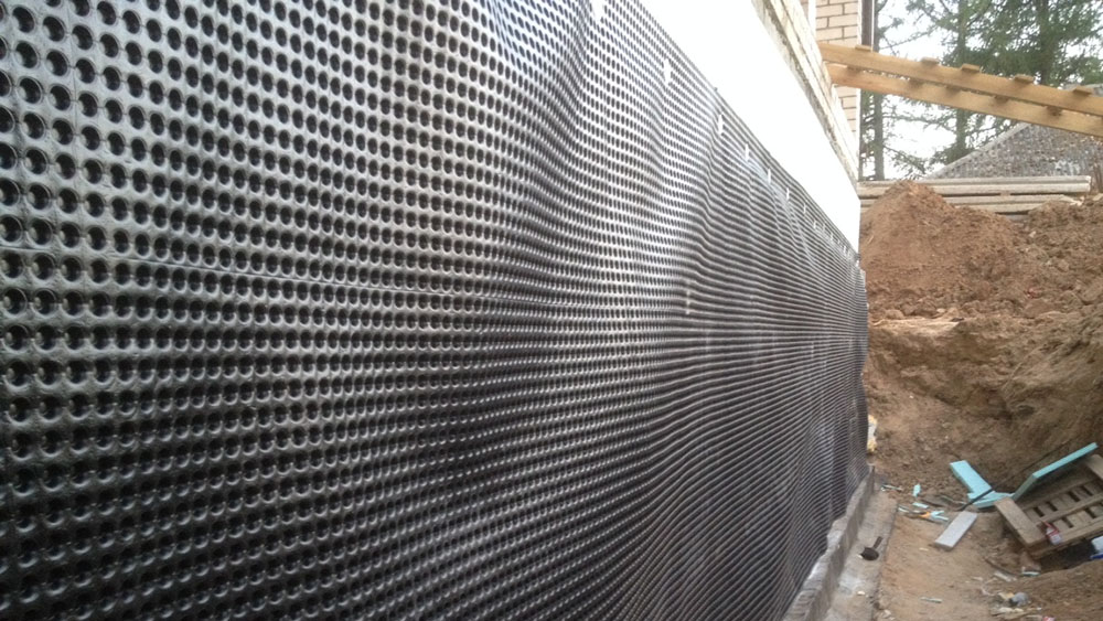 - Type profilé. Le HDPE est utilisé dans la fabrication. L'apparence ressemble à des feuilles avec des pointes ou des projections sur un côté. Un tel tissu peut être monocouche ou multicouche. Il est également utilisé avec des éléments géotextiles. L'épaisseur de la membrane profilée est de 0,5 à 1 mm, la longueur de la saillie est de 8 à 20 mm. Les toiles sont fixées directement au mur.La membrane profilée est utilisée pour l'imperméabilisation de la fondation si la nappe phréatique est au-dessus du sous-sol du bâtiment. Ce type d'isolation maintient la pression de l'eau pendant longtemps, sous réserve d'une installation correcte.
