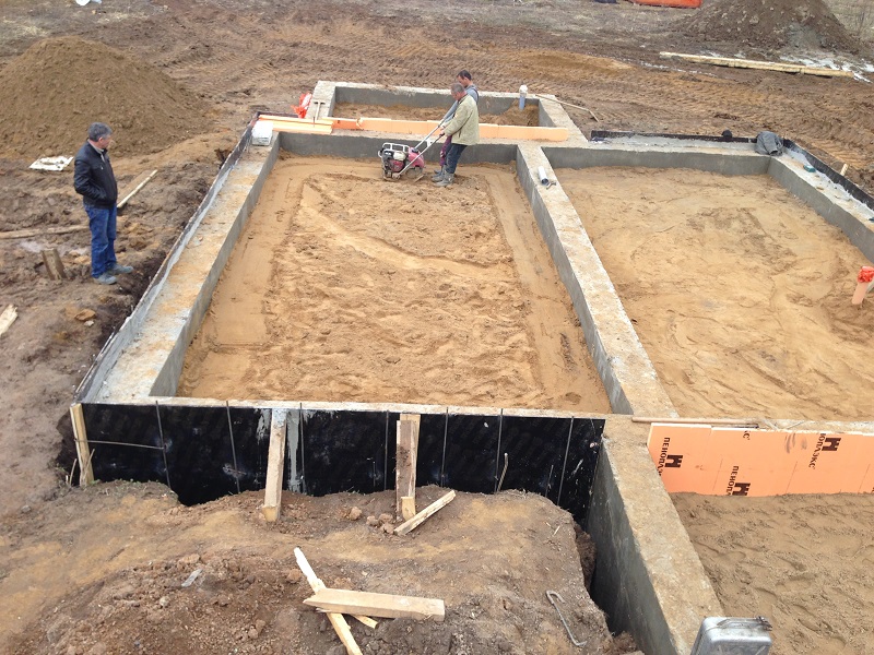 Si le propriétaire ne prévoit pas d'utiliser le sous-sol, le remblayage est fait avec de l'argile à l'intérieur sous la chape de béton pour protéger contre la pénétration des eaux souterraines. Après avoir disposé une couche de 0,3 m, il faut la tasser. Ensuite, un remblai de sable est réalisé, compacté, légèrement humidifié. Une couche imperméabilisante de matériau de toiture est posée sur le dessus. Pour réduire les pertes de chaleur, une autre couche de sable est coulée sur laquelle une chape est organisée.