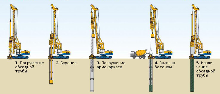 Pour le bétonnage des pieux, des coques à sabot déroulant ou amovible sont immergées dans le sol. Les tubes de tubage des pieux forés sont laissés dans le sol ou retirés lorsqu'ils sont remplis de béton. La technologie n'a aucune restriction en fonction de la densité de l'emplacement des bâtiments dans la ville ; dans de telles conditions, les coques sont enterrées par la méthode du vissage.