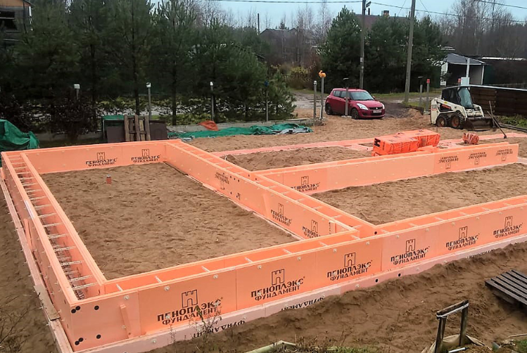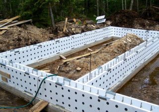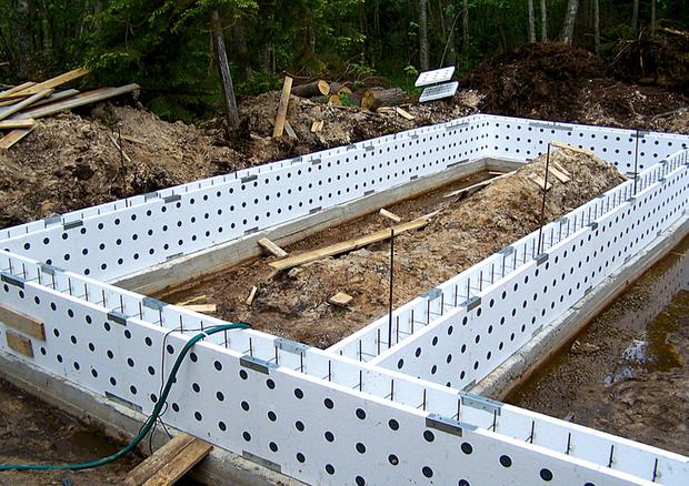 Des plaques de polystyrène expansé de qualité PSB-S avec une densité de 25 à 35, une épaisseur de 40 à 100 mm doivent être placées dans la position de conception conformément aux instructions étape par étape. Les dalles sont reliées par des cloisons monolithiques. Les blocs sus-jacents sont engagés avec les éléments inférieurs grâce à des serrures spéciales et du béton est posé dans l'espace intérieur.