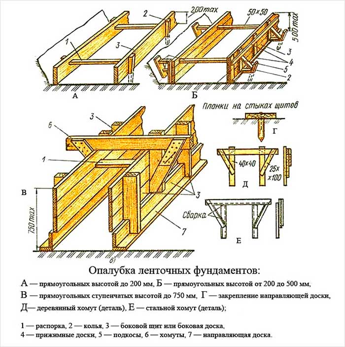 Panneaux ou feuilles de délimitation usagés en aggloméré, OSB avec imprégnation à l'humidité. Le coffrage en contreplaqué pour la fondation est assemblé à l'aide de chapes et de supports en bois, qui sont reliés par des clous ou des vis. Les blocs doivent être placés en rangées de manière à ce qu'il n'y ait pas de vide entre eux, et des plaques de limite doivent être installées à l'extrémité selon un principe similaire.