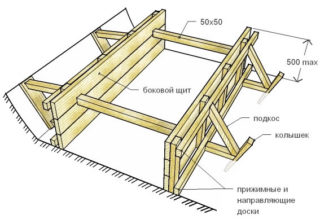 Une attention particulière est accordée à la résistance de la connexion des attaches les unes aux autres, car la masse de béton est lourde et peut compromettre l'intégrité de la structure. La base de la maison est formée correctement si la coque ne laisse pas passer l'eau. La hauteur de la structure auxiliaire dépasse le niveau de la fondation de 15 à 20 cm.Les planches sont renforcées avec des poteaux en bois, qui sont enfoncés dans le sol et placés de 0,7 à 1,0 mètre.