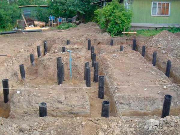 Avant de commencer la construction, vous devez savoir combien de pieux sont nécessaires pour la fondation. Des éléments de support sont installés aux coins du bâtiment et dans les zones où le mur extérieur croise le mur intérieur. Des piles supplémentaires sont placées le long des côtés longs de la maison. La distance entre les supports doit être de 2 mètres.
