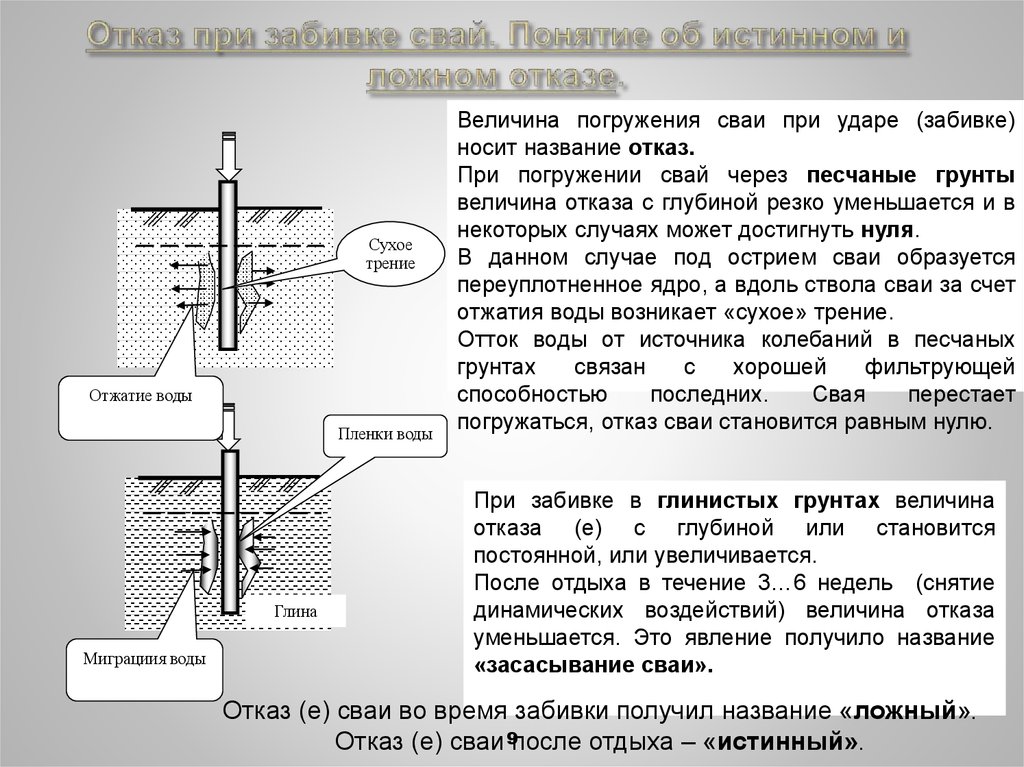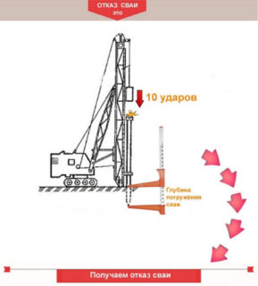 Faux est obtenu immédiatement après la fin de la plongée au point où sa profondeur à partir de la caution est identique au plan du projet. Une véritable défaillance se produit après un certain temps après la suppression de la charge statique et la terre a le temps de restaurer sa structure. La méthode de détermination de cette valeur au moyen des coups d'un marteau spécial conçu pour le battage des pieux est appelée essais dynamiques. La durée de la pause varie en fonction des conditions du sol inhérentes à la zone.