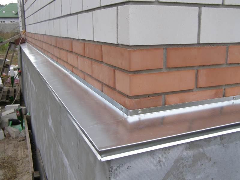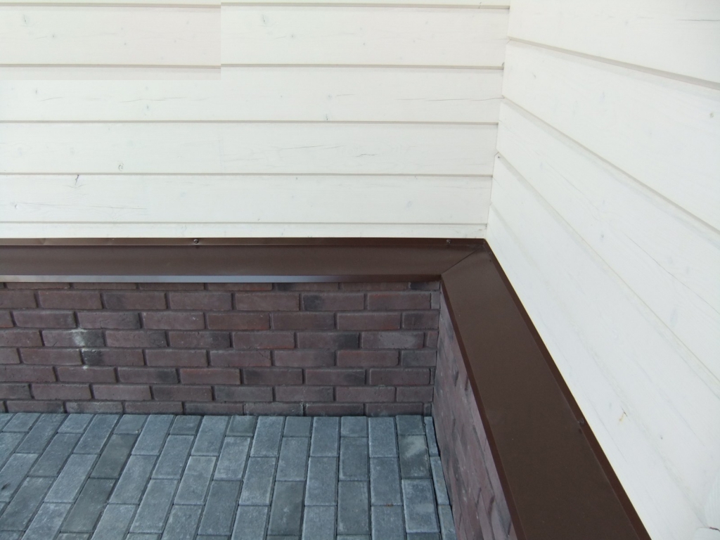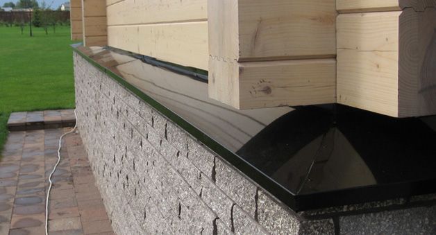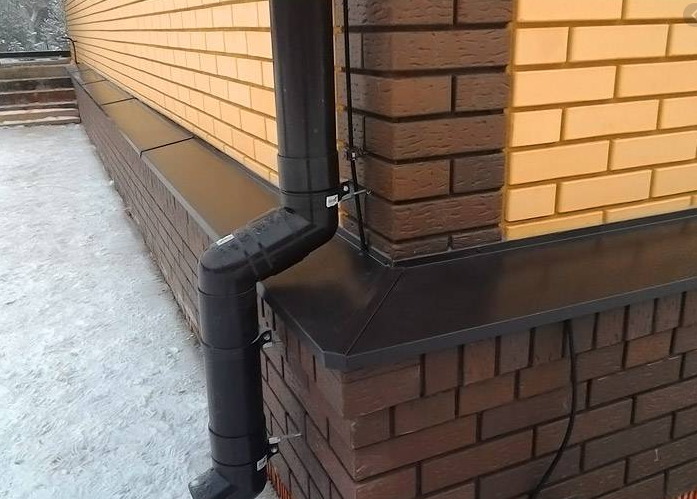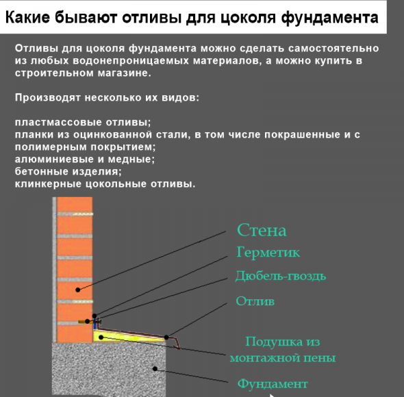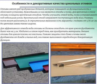Les drains sont installés sur le plan saillant de la base du mur à la jonction avec le socle. Leur fonction est de protéger l'articulation des facteurs négatifs. Les marées descendantes pour la base du sous-sol protègent contre la pluie, l'accumulation de neige, la glace et le fort échauffement par le soleil. Les prunes décorent la façade et sont sélectionnées individuellement pour chaque base, en fonction du matériau.