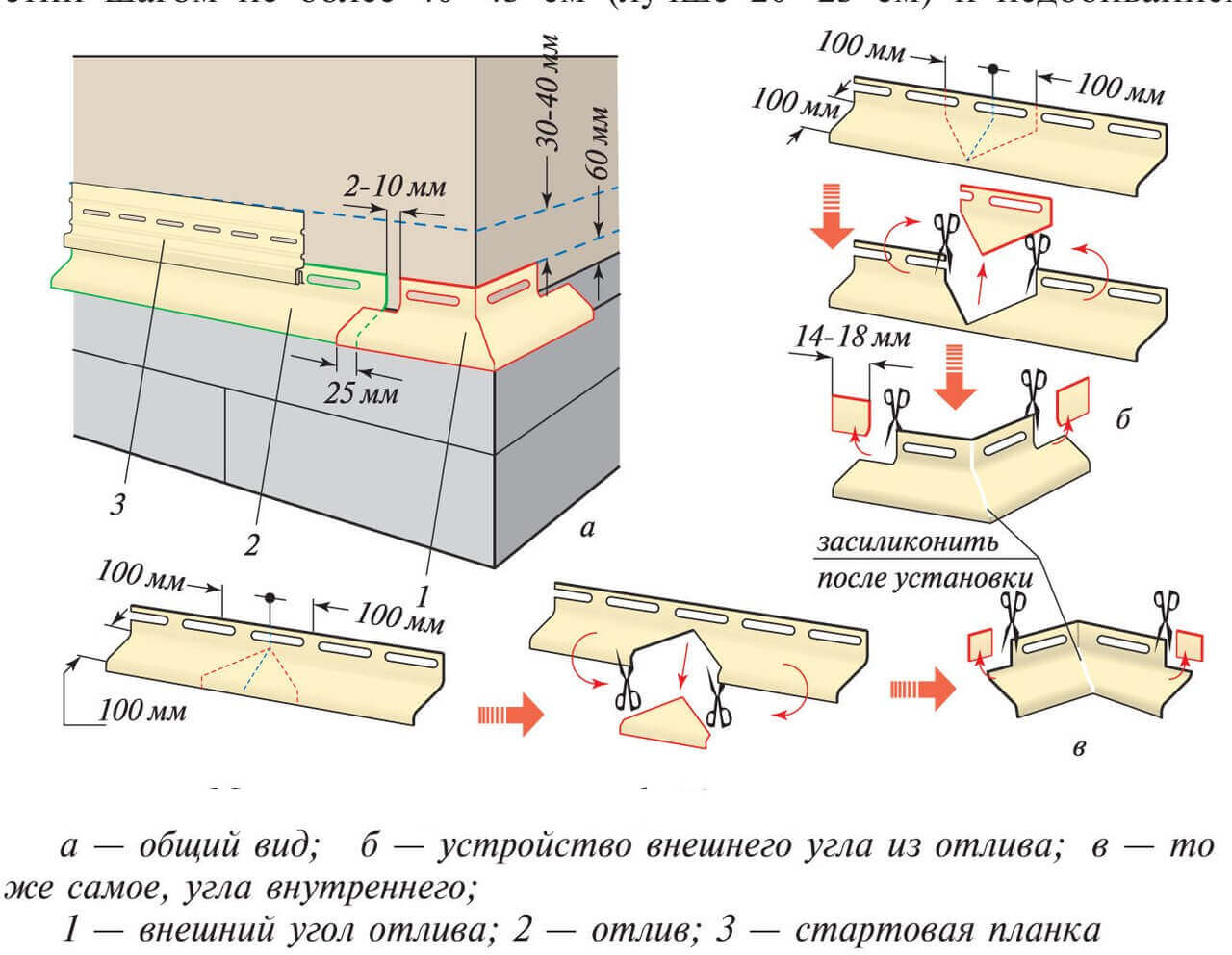 La ficelle est tirée sur la ligne d'installation. Les reflux sont fixés directement au mur ou l'élément de guidage est monté en premier. Le drain est fixé à la barre avec des vis autotaraudeuses et il est cloué au mur avec des chevilles métalliques.Les bandes sont placées avec un chevauchement de 3 centimètres, les joints sont remplis de mastic pour une utilisation en extérieur.