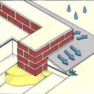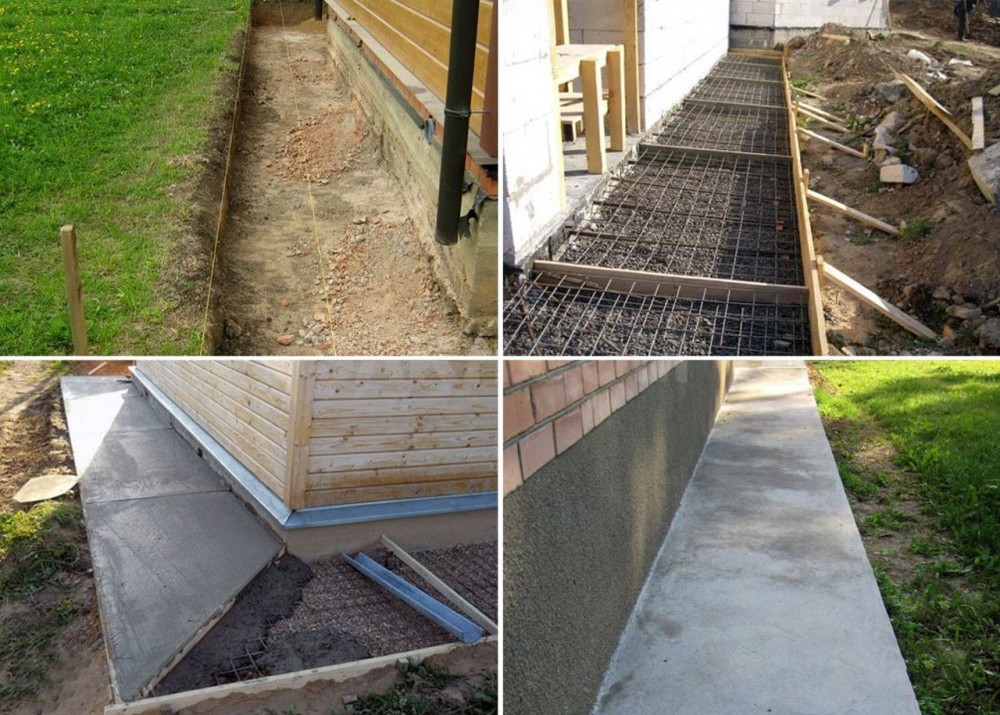 Extérieurement, la zone aveugle est une large marche située le long du périmètre du bâtiment. La structure a une pente de 2-3% dans la direction des murs. La dimension de la marche selon SNIP doit être d'au moins 80 cm lorsque la saillie du toit est dépassée d'au moins 20 cm.