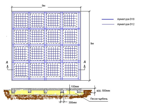 La base monolithique est renforcée par deux filets, qui sont placés dans les couches inférieures et supérieures de béton. Des liens et des cadres sont fournis entre les éléments plats pour le soutien.