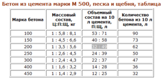 Les proportions de la composition du béton pour la fondation du ciment M500, du sable et du filler pour la préparation de différentes qualités de béton dans un seau (en kilogrammes):