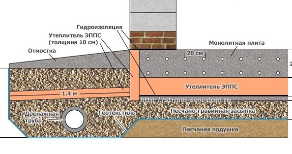La diminution de l'humidité se produit à l'aide de mesures d'ingénierie et de remise en état. Au stade de la construction de la fondation, des travaux sont en cours sur la disposition des égouts pluviaux, le drainage, les bacs de drainage. Les précipitations atmosphériques, les eaux de fonte et les eaux souterraines sont évacuées du site par un système de fossés ou de tuyaux de drainage. Les tranchées sont creusées avec une pente, des tuyaux perforés enveloppés de géotextiles y sont placés. La pierre concassée sert de remplissage.