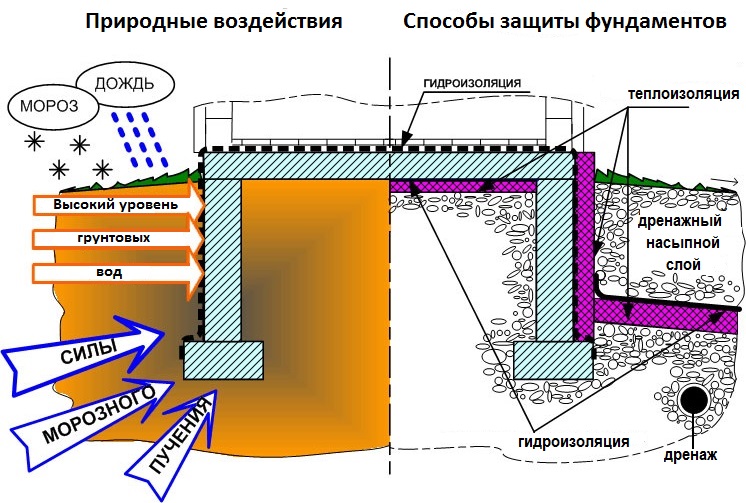 Au stade de la conception du bâtiment, les influences extérieures sont prises en compte. L'un des phénomènes dangereux est le soulèvement du sol par le gel. Le sol en expansion inégale exerce une pression sur la base de la maison. La déformation de la fondation entraîne des dommages aux murs et au toit.
