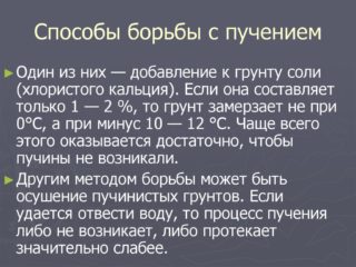 Le sol gonfle si le liquide qu'il contient gèle. La glace est moins dense que l'eau et tend à occuper un plus grand volume. L'expansion conduit au cisaillement des particules de sol et au gonflement des couches de terre. Les sols fortement contiennent une grande quantité d'humidité, de sorte que la construction de fondations dans de telles couches devient risquée si vous ne prenez pas de mesures.