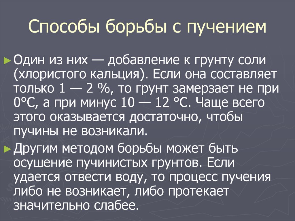 En hiver, le gonflement est si puissant qu'il soulève la base d'appui avec le bâtiment, tandis qu'au printemps, la structure surélevée ne revient pas à sa position habituelle. La densité des inclusions de glace est de 916 kg/m3, le même indicateur d'eau est de 1000 kg/m3. Cela suggère que le volume de glace est supérieur de 9% à la capacité cubique d'eau, par conséquent, une charge supplémentaire est créée sur la structure de la couche terrestre. Le sol se déplace sous l'action de la force de pression, mais ne peut pas déplacer les couches profondes, mais soulève la partie supérieure avec le bâtiment.