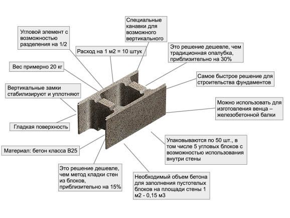 Les structures ont des dimensions et des poids standards, elles sont réalisées en béton lourd, dense (silicate) ou léger (poreux). Les blocs solides ont un plus grand nombre de tailles standard. Les produits sont fabriqués avec une longueur de 780, 880 mm, une hauteur de 280 mm. Leur poids est moindre, ils sont donc plus faciles à utiliser dans la construction privée.