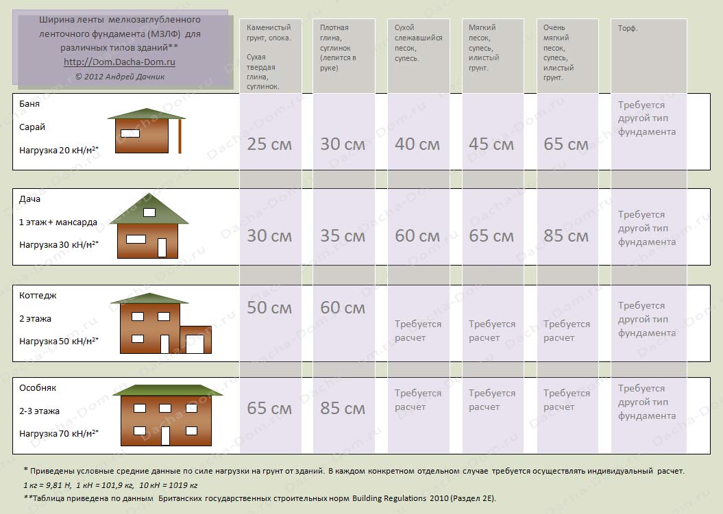 Ce type de socle est utilisé pour la construction de bâtiments en briques, de maisons en blocs de mousse, de parpaings et de béton monolithique. La condition principale pour choisir un matériau pour les murs est une densité ne dépassant pas 1300 kg / m3. La conception est considérée comme optimale si le site est caractérisé par l'hétérogénéité du sol. La portée dépend du type de fondation :