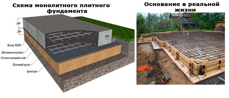 - Plaque. Il s'agit d'une dalle réalisée par coulage de coffrage ou d'une structure préfabriquée de plusieurs voussoirs. Il est utilisé pour la construction sur des sols argileux et limoneux instables. La structure monolithique assure une répartition uniforme de la charge au sol.