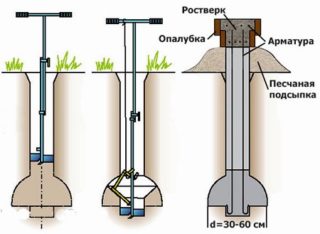 - Forage. Installé dans un sol sec et dur. Le béton est coulé dans un trou creusé dans le sol. La rétention se produit en serrant les murs ou en se reposant sur une couche solide de sol.