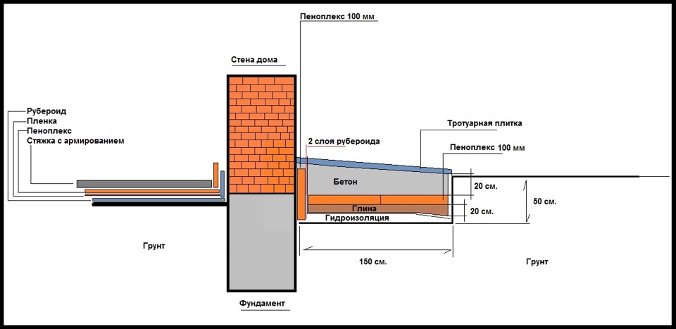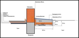 Cette conception est nécessaire pour protéger le ruban de fondation du contact avec l'humidité. Avec une installation correcte de la zone aveugle, les précipitations et l'eau de fonte ne pénètreront pas dans les interstices de la tranchée remplie. La structure elle-même est une coulée de béton adjacente à la paroi extérieure de la fondation ou du socle. La largeur de la zone aveugle peut atteindre 0,6 m et dépasser légèrement celle de la partie saillante de la toiture. Le coffrage se compose de planches placées verticalement. Entre eux et le mur, un treillis de renfort est disposé pour augmenter la résistance et éviter les fissures. Le sol est recouvert de géotextiles.