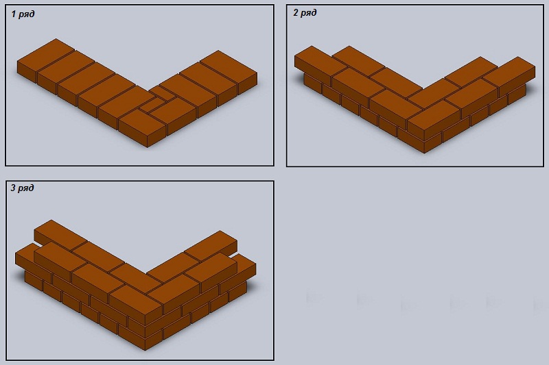 Les pièces d'angle sont d'abord disposées sans solution d'essayage. Cela vous permet d'évaluer la gravité des angles droits et l'horizontalité de la surface. Après avoir placé les lacets de contrôle, commencez à "finir" la pose à l'aide du mélange. Il est nécessaire d'assurer la ligature mutuelle des briques d'angle. Une couture verticale ne doit pas être autorisée sous une autre. La précision des angles droits permet d'évaluer la comparaison des valeurs des diagonales (elles doivent être les mêmes).