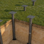 - Visser. Les pieux sont des tuyaux en acier creux avec une pointe pointue. Le produit est équipé de lames, grâce auxquelles elles peuvent être vissées dans le sol et maintenues dans celui-ci à n'importe quelle température et humidité. Après vissage des pieux, leurs têtes sont alignées horizontalement et du mortier de béton est coulé dans les tuyaux. La longueur standard des produits est de 165 et 330 cm, ce qui est largement suffisant pour descendre en dessous du seuil de congélation. Les avantages d'une fondation à vis sont une position stable dans le sol et la possibilité de monter sur un terrain accidenté.