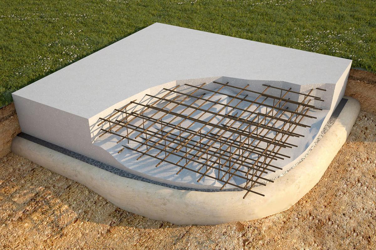 - Plaque. Les fondations monolithiques sont utilisées dans la construction sur des sols instables ou pour la construction de structures où il n'est pas nécessaire de faire un sous-sol et de poser des communications souterraines. La technologie de la dalle est assez simple, mais elle nécessite beaucoup de matériaux. Après des fragments de la fosse, une imperméabilisation, une isolation, un oreiller et une cage de renforcement y sont placés. Ensuite, le béton est coulé.La dalle finie est en même temps un sous-plancher, ce qui devient un gros plus pour le développeur. L'inconvénient de cette solution est que la fondation présente une légère élévation au-dessus du sol, ce qui nécessite l'aménagement du sous-sol ou une finition supplémentaire des rebords inférieurs de la maçonnerie. Sinon, la maison en rondins deviendra constamment humide et moisie.