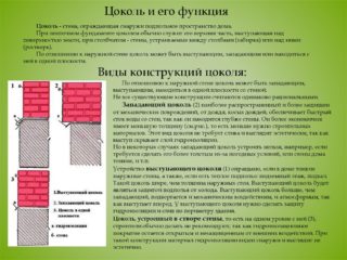 La base de la maison est faite de matériaux résistants à l'humidité qui ne sont pas mouillés par les congères, l'eau de pluie. La hauteur du sous-sol est importante et varie selon la région de construction, le matériau des murs de la maison et les caractéristiques du sol. La base hors sol est séparée par une imperméabilisation horizontale des murs du bâtiment afin que l'humidité ne pénètre pas dans les structures d'enceinte verticales.