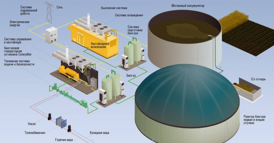 Au fur et à mesure que la décomposition progresse, un mélange gazeux est généré, qui est déchargé dans l'accumulateur. La teneur en soufre est réduite par des bactéries spéciales qui colonisent les parois du réservoir. Après nettoyage, le combustible entre dans le département de cogénération, où l'électricité est produite par des générateurs à piston à gaz. Dans d'autres variantes de stations, le gaz est amené à la pression de fonctionnement requise par des compresseurs et pénètre dans le réseau de distribution.