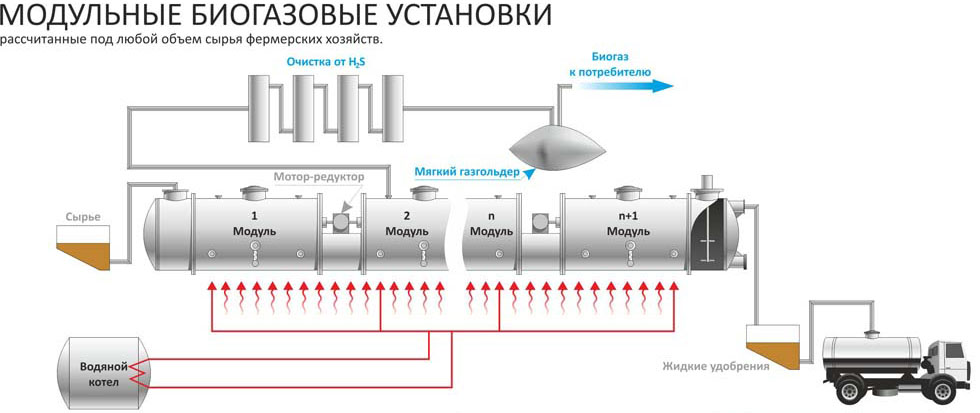 L'industrie produit des installations de biogaz pour les fermes. Le volume du bioréacteur varie de 0,5 à 30 m³... Système complet avec réservoir sur 1m³, par exemple, BUG-M, contenant tous les composants nécessaires, coûte environ 180 mille roubles... Installations pour exploitations avec troupeaux de bovins 12 têtes ou 1000 oiseaux coûtera 2 millions de roubles.
