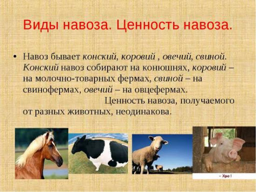 Fumier peut être de deux types : naturel et auto-allié. La première espèce est prélevée sous l'animal avec la litière. L'espèce auto-alliée est retirée de la ferme par un jet d'eau.