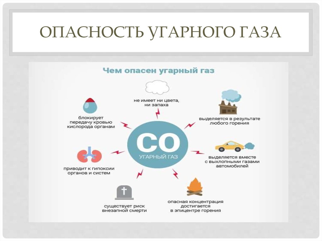 Monoxyde de carbone - monoxyde de carbone, un gaz incolore et inodore... Il pèse moins que l'air et monte jusqu'au plafond, ce qui le rend difficile à détecter. La substance brûle parfaitement, et explose lorsqu'une certaine concentration est atteinte.