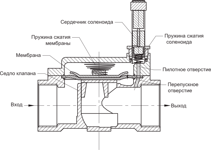 Une vanne à gaz de ce type peut être une vanne de régulation ou une vanne d'arrêt, elle est commandée manuellement ou à l'aide d'un système automatique. De par sa conception et sa destination, cet élément ressemble à son homologue standard à la différence que l'obturateur qu'il contient est mis en mouvement par un électro-aimant complété par un noyau mobile. Lorsque la bobine est alimentée, elle commence à pousser ou à tirer dans le noyau qui est connecté à la tige. Une telle pièce est destinée à être utilisée dans les installations industrielles, les systèmes de chauffage domestique et dans le domaine de l'approvisionnement en eau. Le dispositif de vanne a une conception standard :
