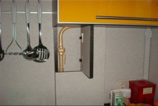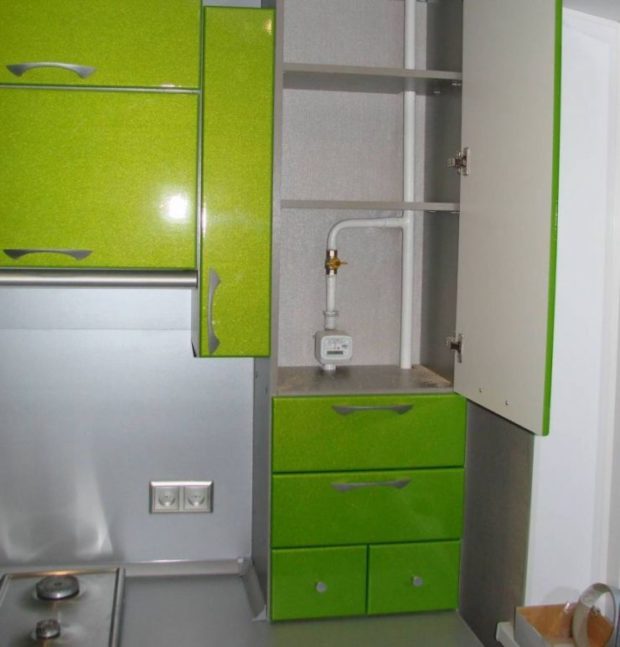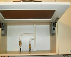 Des fragments disposés verticalement, ainsi que des compteurs, des capteurs et des colonnes, sont cachés dans spécialement conçus pour cela fausses armoires... Ils reproduisent exactement le design des meubles de cuisine fonctionnels et forment un tout avec celui-ci. Dans ce cas, la partie basse de l'armoire reste libre et peut être utilisée pour loger du matériel. L'exigence est la même que pour le masquage des sections horizontales de la ligne : il doit y avoir un libre accès aux tuyaux.