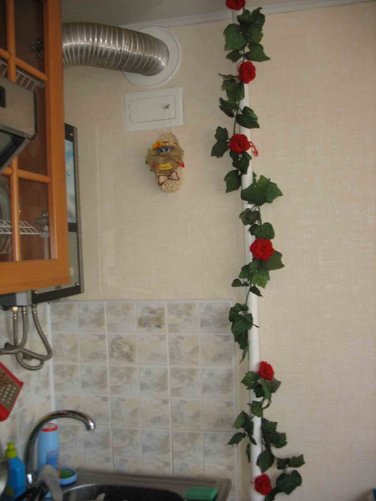 Le gazoduc peut monter dans une rangée d'armoires murales... Pour ce faire, une rainure est réalisée dans les parties arrière et latérales et les casiers sont fixés de manière à ce que le tuyau repose à l'endroit prévu. C'est important que l'accès à la canalisation est resté libre, et l'air a circulé dans le placard d'une manière ou d'une autre.