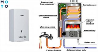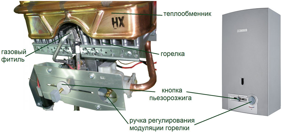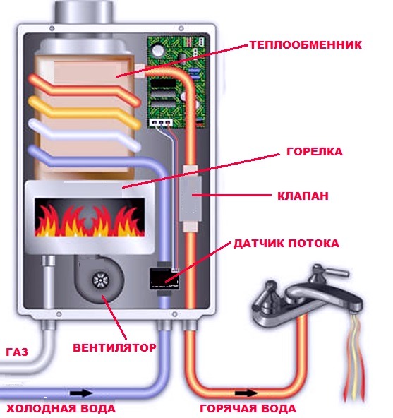 En coulant unités, il n'y a pas de réservoir de stockage. La température de l'eau augmente lors du passage dans l'échangeur de chaleur, sous lequel se trouve un brûleur avec un allumeur.