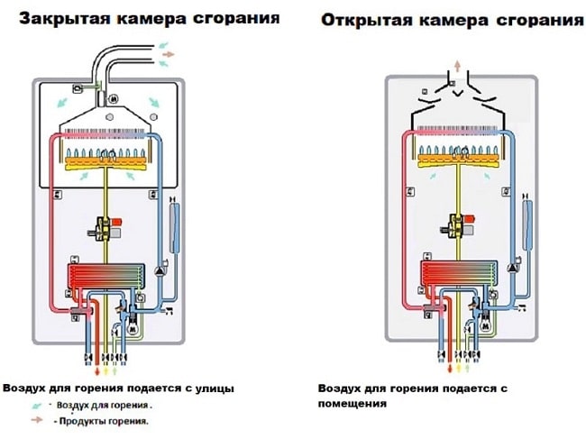 DANS chambre fermée l'air est forcé à l'intérieur, les produits de la combustion du gaz sont éliminés par la même méthode. Une option plus sûre, puisqu'une cheminée coaxiale est utilisée, où deux tuyaux sont combinés pour évacuer la fumée et fournir de l'air. En raison du fonctionnement des turbines, le coût augmente.