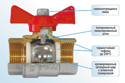 La pièce est commandée par un levier complété par des bagues étanches. Les robinets à tournant sphérique présentent de nombreux avantages, notamment une bonne étanchéité et des propriétés isolantes élevées. Les grues modernes sont légères grâce à l'utilisation de métaux et d'alliages spéciaux, se distinguent par une fiabilité accrue et peuvent être utilisées pendant 10 ans sans aucun dysfonctionnement.