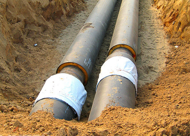 - Sous la terre. Une tranchée est creusée, où la profondeur du gaz, selon le type de sol, est de 100 à 200 cm.Pour créer une protection supplémentaire contre la pression, la pose de gazoducs souterrains s'accompagne de l'utilisation d'une coque extérieure. Cette méthode est coûteuse, mais elle vous permet de protéger les communications des températures extrêmes et des influences extérieures.