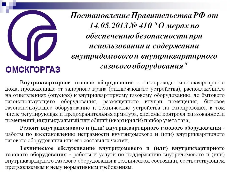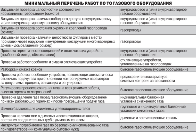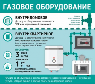 Jusqu'en 2006, l'entretien des réseaux de gaz était inclus dans le tarif général. Depuis lors, les utilisateurs paient pour l'entretien des équipements au gaz dans un appartement et une maison comme pour un type de service distinct. Il s'effectue sur la base d'un accord avec les locataires. Selon la clause 10.3.1 de la norme industrielle 153.39-3.051 - 2003, ces contrôles doivent être effectués au moins une fois tous les 3 ans avant la fin de la durée de vie établie.