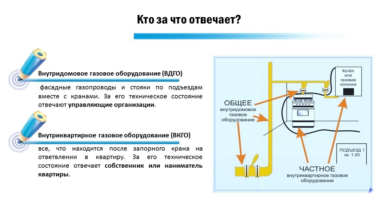 La loi actuelle impose responsabilité de l'état technique du réseau de gaz et appareils électroménagers par propriétaire bâtiments ou logements. Les propriétaires concluent des accords avec les organismes de licence pour le diagnostic, l'entretien, le remplacement et la réparation.