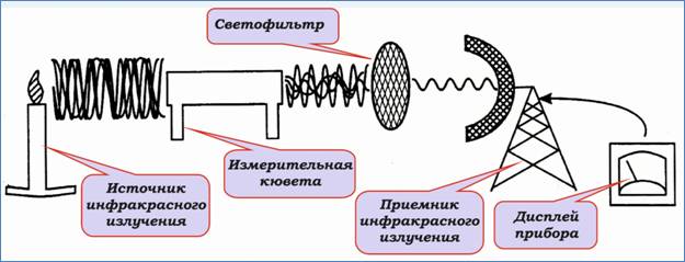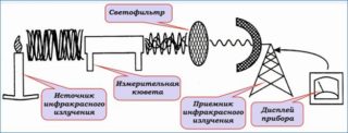 Le principe de fonctionnement des compteurs optiques repose sur la capacité de chaque type de substance gazeuse à absorber des rayons infrarouges de même longueur. L'appareil calcule la concentration à partir de cette caractéristique.