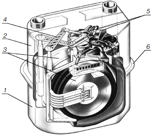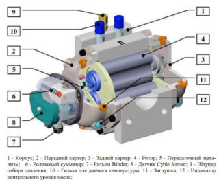 Le principe de fonctionnement est le suivant : 2 rotors en forme de huit tournent dans le corps en roulant avec des surfaces latérales. Le premier est associé au mécanisme de transmission, le second au mécanisme de comptage. Les rotors tournent en raison de la différence de pression de gaz qui se produit lors de l'entrée par l'entrée et de la sortie par la sortie.
